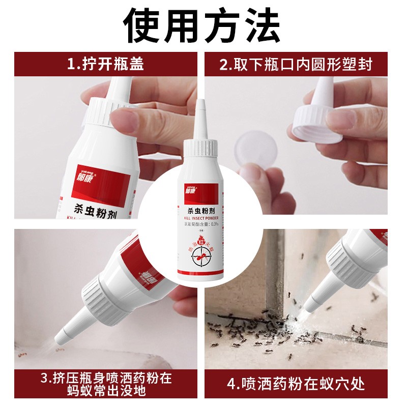 1.在蚂蚁、蜚蠊、跳蚤经常出入处撒药,3克/平方米。2.防治红火蚁,先干扰、破坏蚁巢表层,待红火蚁涌出后再将药剂均匀环状或点状撒施于蚁巢表面,让蚁群接触、粘附药剂。3.施药后24小时内遇到雨天,需补施药剂。晴天施药,施药时地面要求干燥,施药后不得洒水或灌溉。