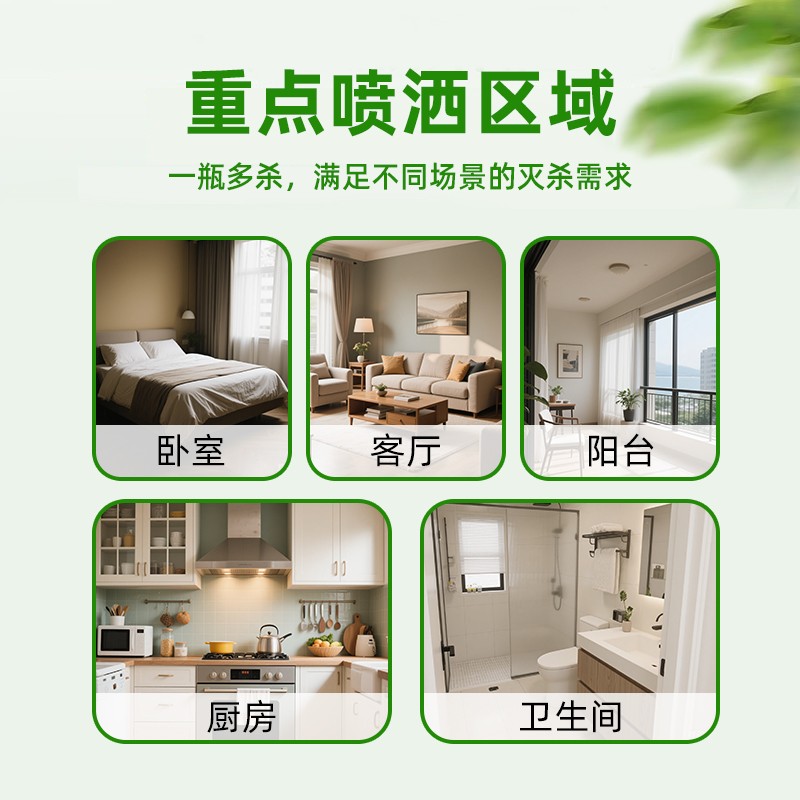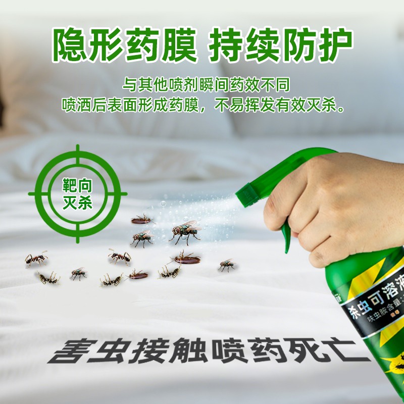 使用本品时,对蝇、蚂蚁、跳蚤、蜚蠊(蟑螂)、臭虫栖息和经常出没的地方喷雾。